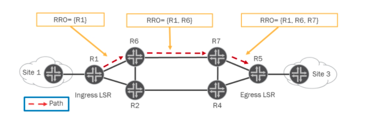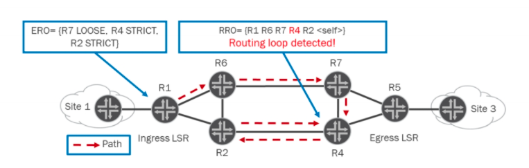 If a node receives a PATH message with one of its own local addresses already listed within the RRO, the LSR sends back a PathErr message indicating a Routing Loop detected and aborts the LSP setup.