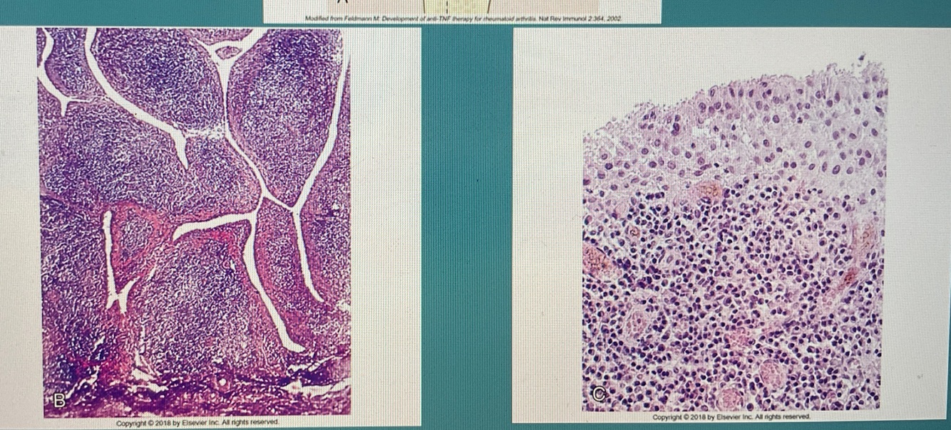 Left - usually single line of synovial cells (white spaces) but it hypertrophy and -plasia in RA