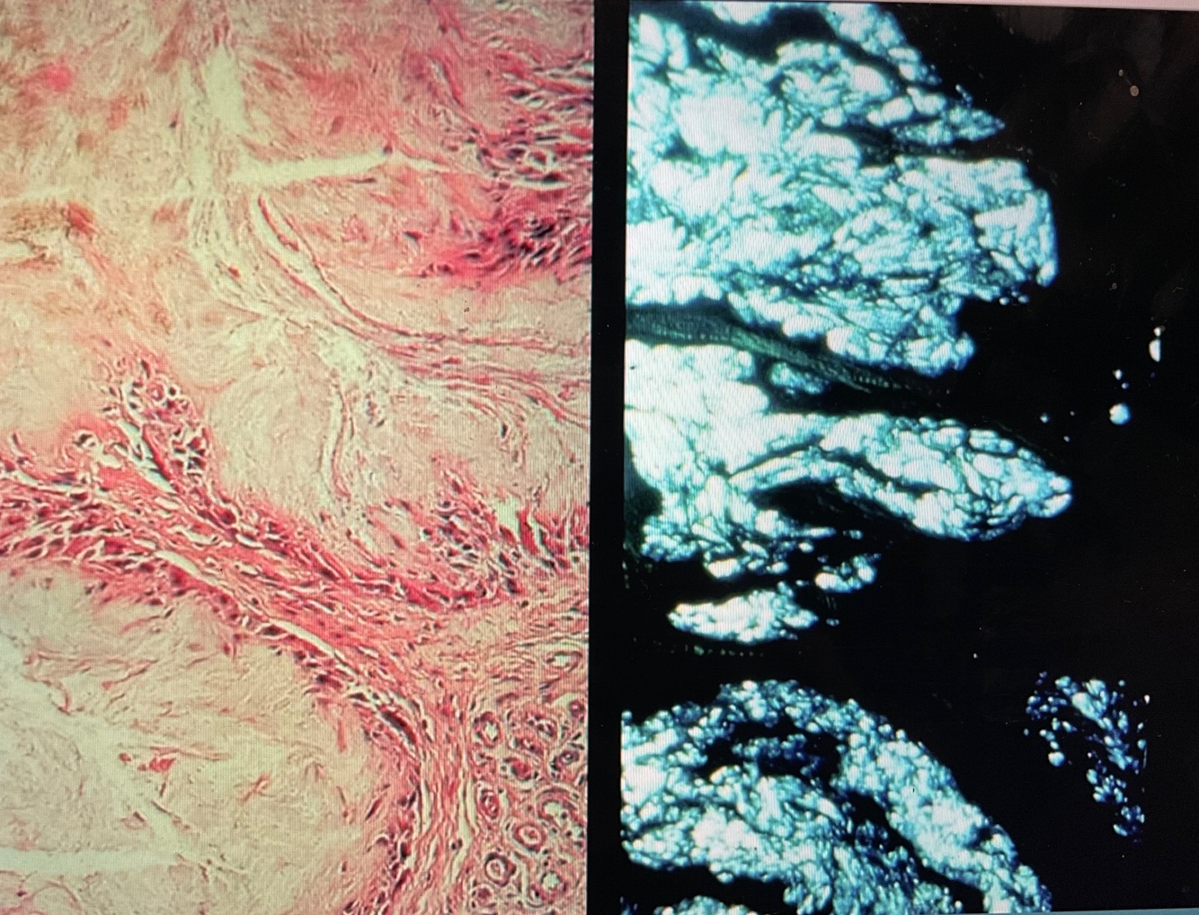 White area is the crystals and around it is the histiocytes try to eat it and for a ring (granuloma like)