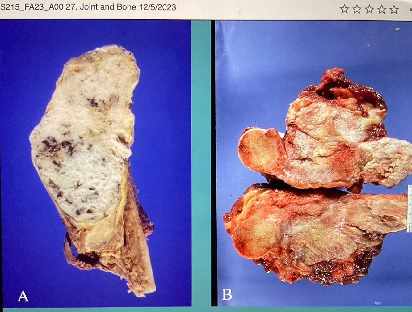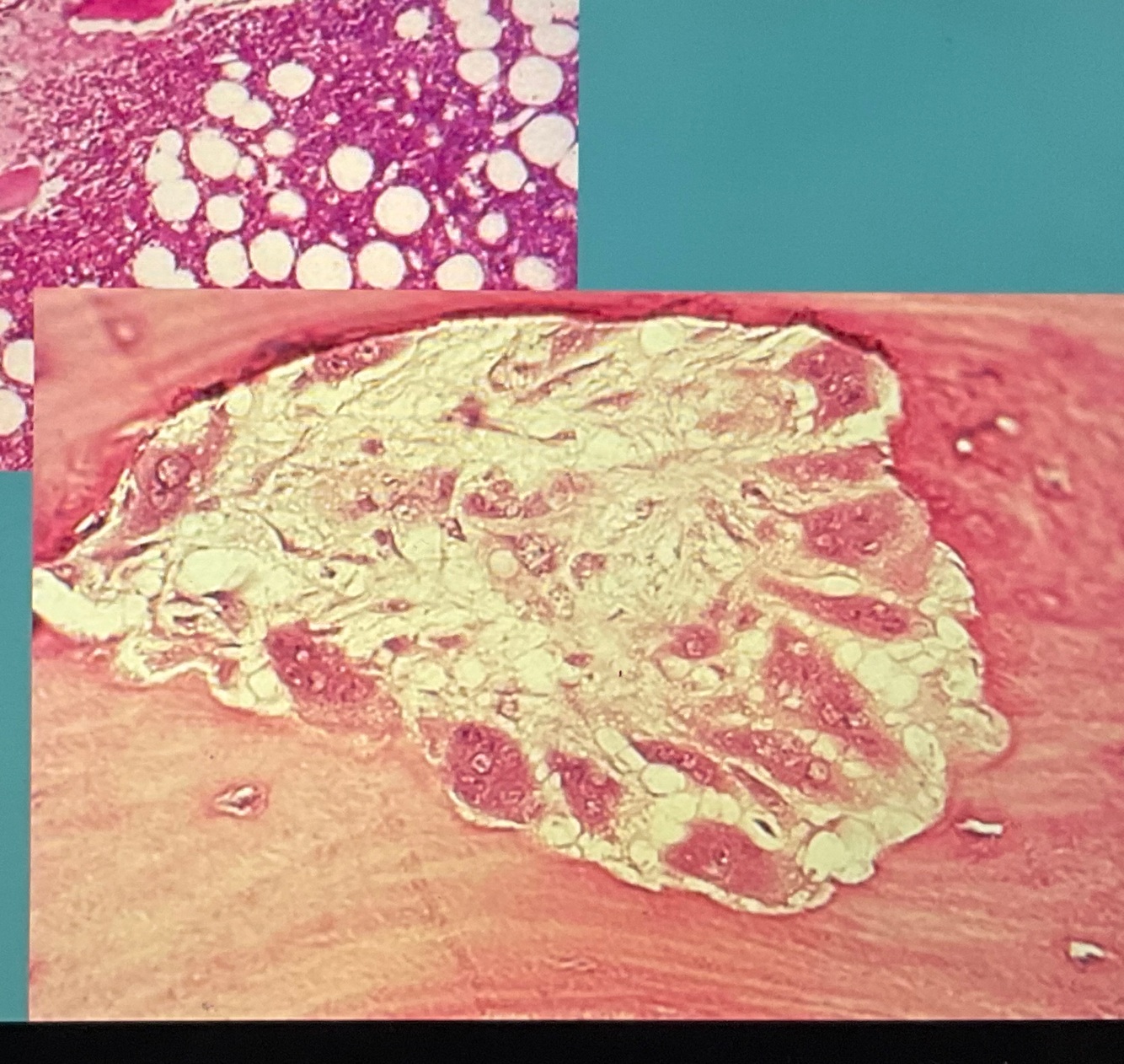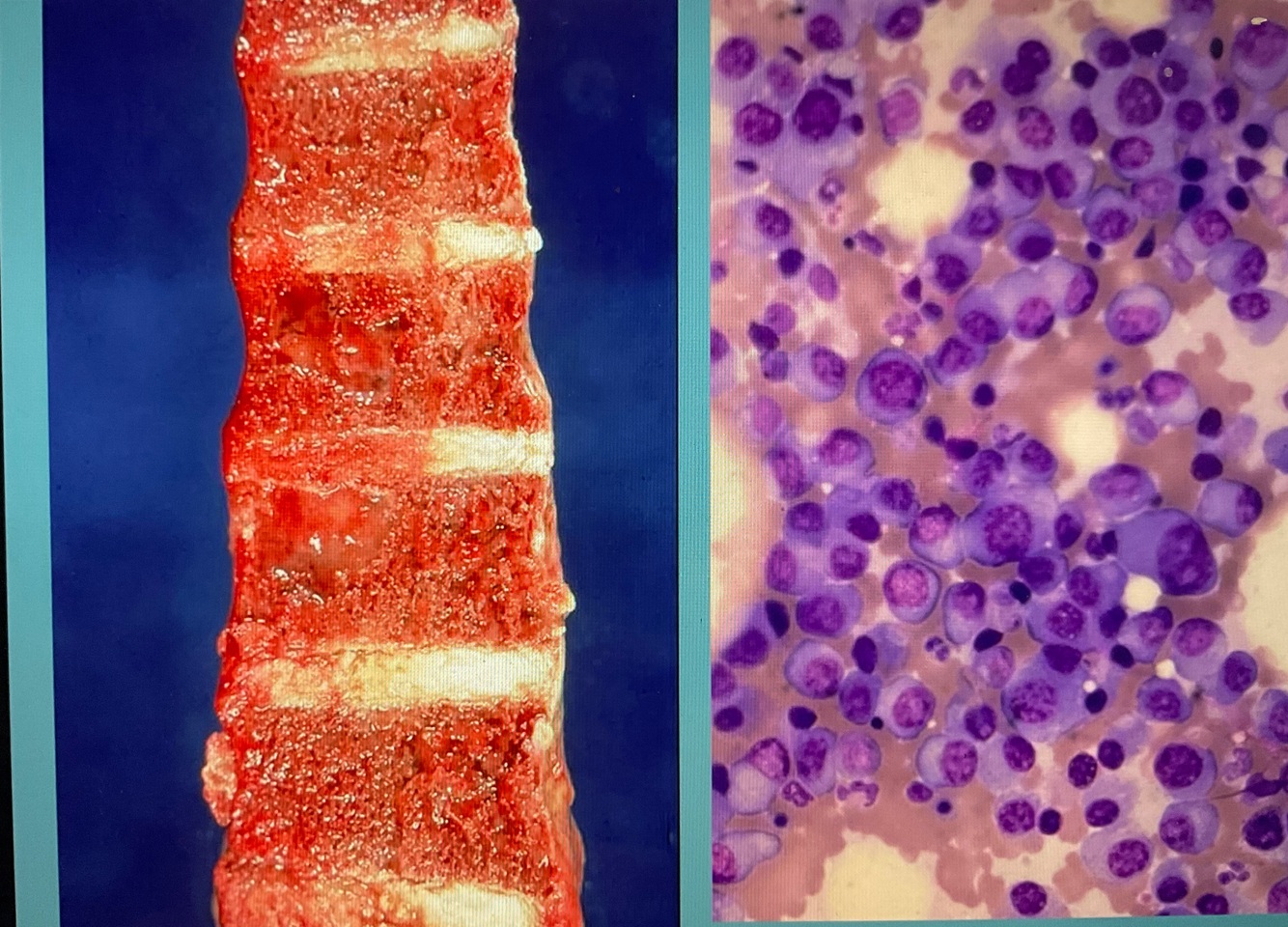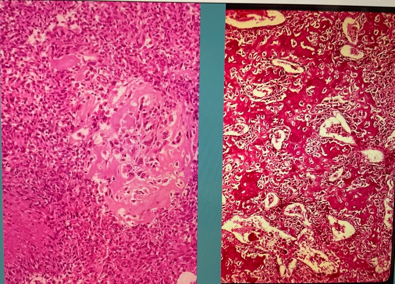 Left - Blueish parts are tumor cells and are very active ( you can tell it originated from the bone because it is making the pink around the area)