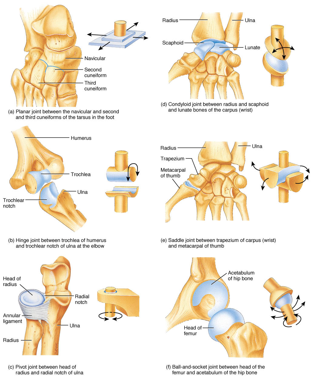 3) Synovial = (Plane, Hinge, Pivot, Condylar, Saddle, Ball and socket)