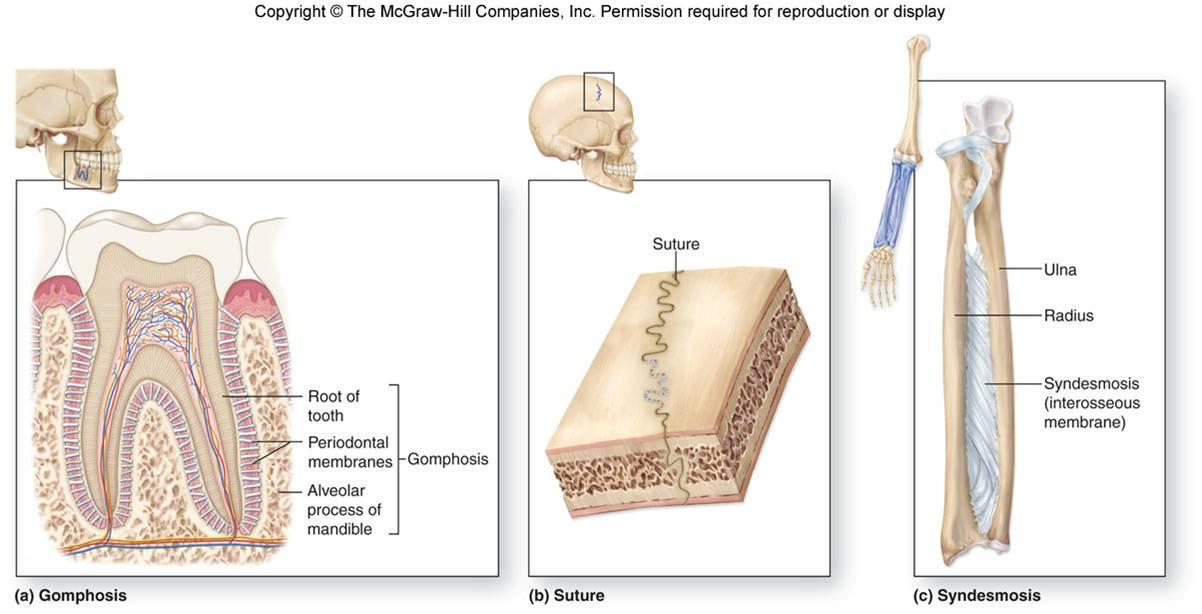 Bone ends / parts united by collagen fibers 1) Suture = short fibers / immobile (Synarthrosis) 2) Syndesmosis, = longer fibers / slightly movable (amphiarthrosis) & immobile 3) Gomphosis = periodontal ligament / immobile (synarthrosis)
