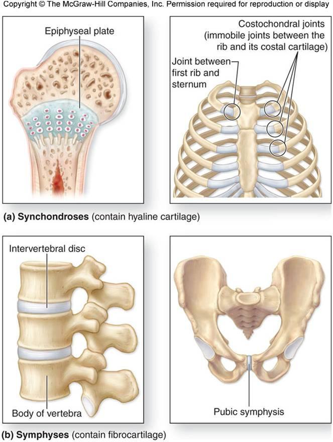 Bone ends / parts united by cartillage 1) Synchondrosis = hyaline cartilage / immobile (synarthrosis) 2) Symphysis = fibrocartilage / slightly movable (Amphiarthrosis).