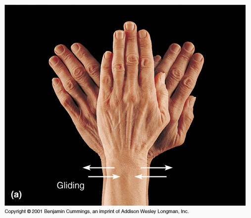 when flat bone surfaces glide or slide over one another. Occur at cartilaginous joints; Ex. = intervertebral discs and sternoclavicular joints.