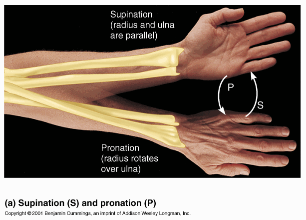 movements between the radius and ulna at the proximal radioulnar joint Ex. thumb up = supination; thumb down = pronation;