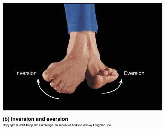 movement of foot; Ex. sole inward = inversion; sole out = eversion