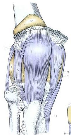 distal part of quadriceps muscle, thick fibrous band passing from apex of patella to the Tibial tuberosity. On both sides it receives the lateral and medial patellar retinacula (expansions of Vastus muscles and overlying