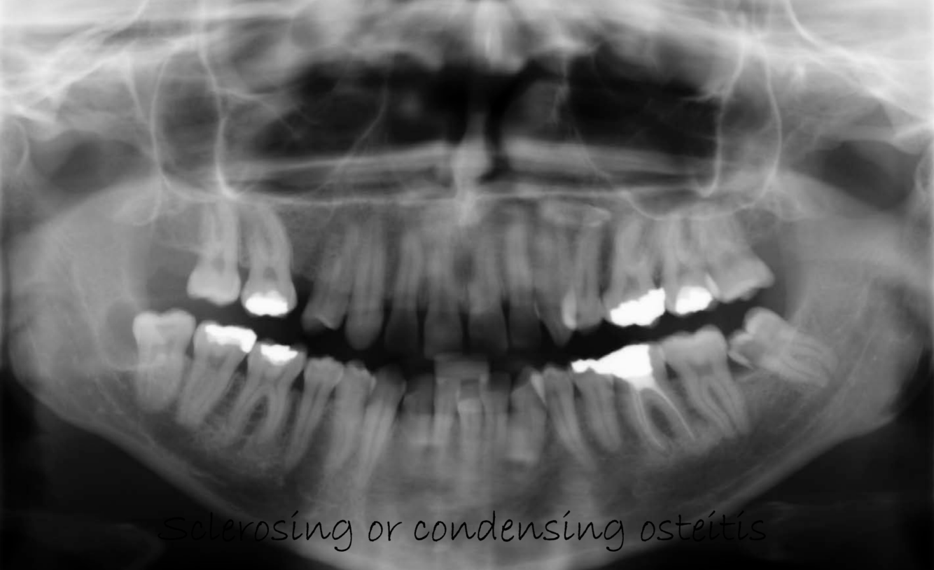 Circumscribed, well defined, radiolucent area periapically with sclerotic bone surrounding