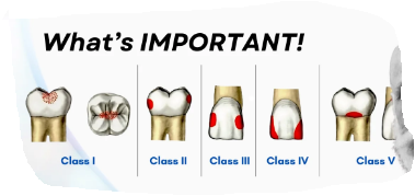 Class VI: Never described by Black, later added by W.J. Simon in 1956: caries affecting the cusp tips of molars, premolars, and cuspids.