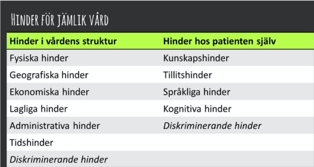 Vilka olika hinder finns det för jämlik vård? (2p)