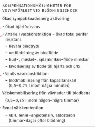 Hur kompenserar kroppen för chock som beror på blodbrist? (3p)