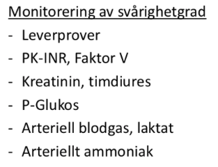 Vilka blodprover kan man ta för att monitorera svårighetsgraden av den akuta leversvikten? (3p)