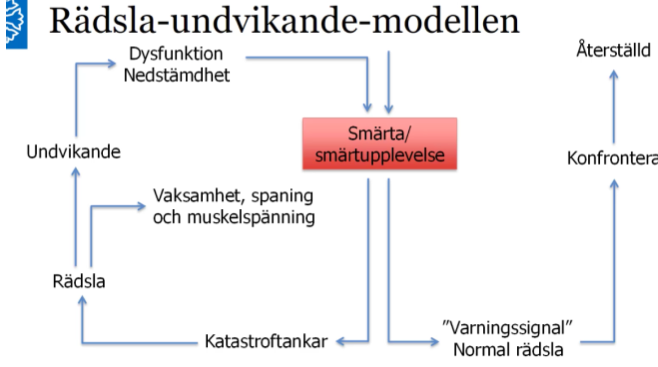 Smärta kan antingen leda till att man känner på smärtområdet och sen ba fortsätter promenera utan o tänka på det. Men det kan å andra sidan leda till jobbiga tankar att man har någon sjukdom och därför undviker vissa beteenden eller aktiviteter som leder till dysfunktion och nedstämdhet.