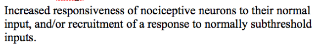 Nociplastisk smärta = Smärta som uppstår pga förändrad nociception trots inga tecken på vävnadsskada som aktiverar nociceptorer. Det finns då heller inget bevis på sjukdom eller lesion av somatosensoriska systemet. T.ex. fibromyalgi