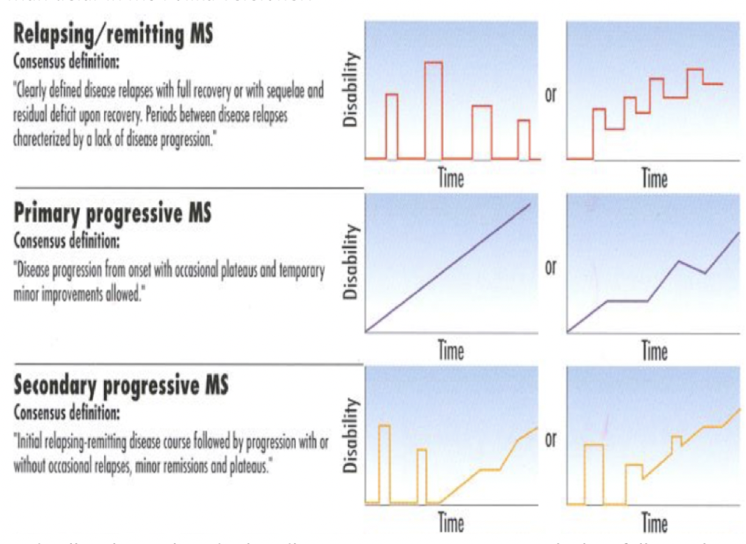 Vad gäller sjukdomsmekanismen vid en MS så är det autoreaktiva T-celler som passerar BBB och angriper olika komponenter i CNS, således en autoimmun sjukdom. Vi får en kaskad av immunologiska reaktioner där myelin, oligodendrocyter (som producerar myelinet) och axonen angrips. Detta leder alltså till att vi får en försämrad nervimpulsbildning och man har även en varierande grad av läkning i form av remyelinisering men med tiden får patienterna trots allt ett ökande handikapp och en ökad funktionsnedsättning.