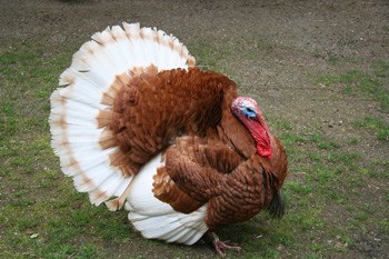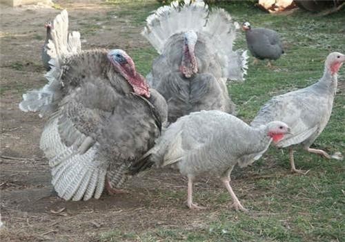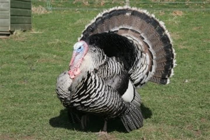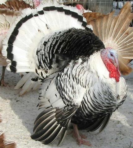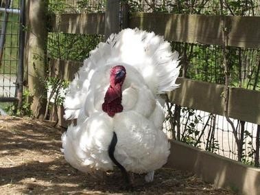 witte breedborstige reuzenkalkoen, zelfde productieve eigenschappen als Bronze Turkey (de kwast is ook hier en altijd zwart!)