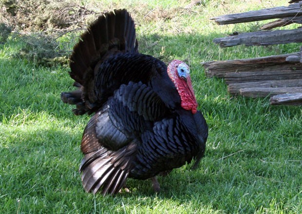 donkerder dan bronskalkoen, maar zonder groen- roodachtige glans, boven aan kleine slagpennen een kenmerkende witte single (Narragansett aftekening), aan uiteinde van veren blauwgrijze tot zwarte vlekken