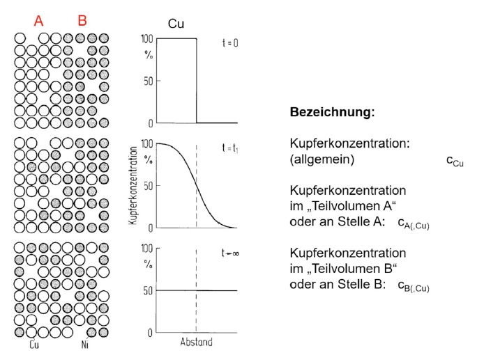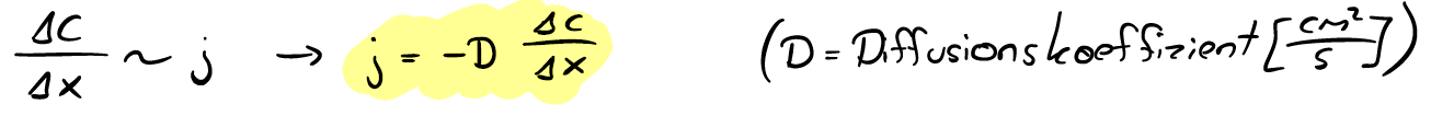 Konzentrationsgradient ist proportional zum Diffusionsfluss mit werkstoffabhängigem Diffusionskoeffizienten D