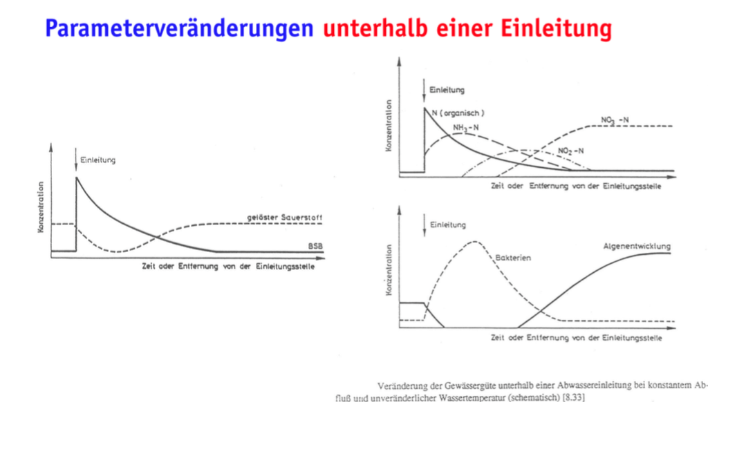 Skizzieren Sie den Verlauf der Veränderung der Parameter O2, BSB5, Norg, NH4, NO2 und NO3, Bakterien und Algenentwicklung unterhalb einer Abwassereinleitung in ein Fließgewässer ?