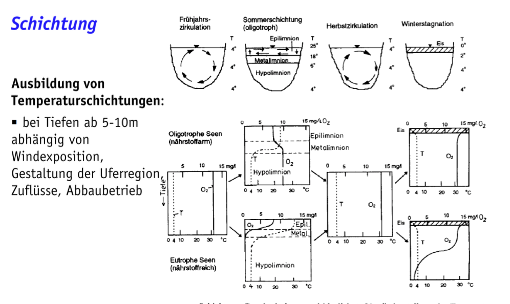 Skizzieren und erklären Sie die Ausbildung der Temperaturschichten von stehenden Gewässern..?