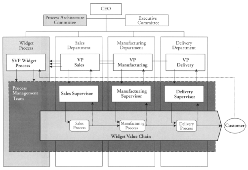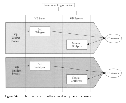 En process manager adskiller sig fra en functional or unit manager, ved at se på alle processerne i værdikæden, og sørge for at disse spiller sammen således, at der skabes mest værdi. I nogle tilfælde kan der blive tale om en sub-optimering i et funktionelt område, for at sikre at værdikæden fungere mere effektivt.