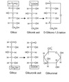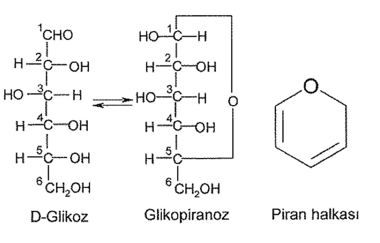 •Glikoz halkalanırken düz zincirde aldehit karbonu olan 1. karbon ve 5. karbona bağlı -OH grubuyla kondanse olarak molekül içi hemiasetal oluşturur. Oluşan altı üyeli halka piran halkasına benzediği için oluşan böyle monosakkaritler piranoz olarak adlandırılır.