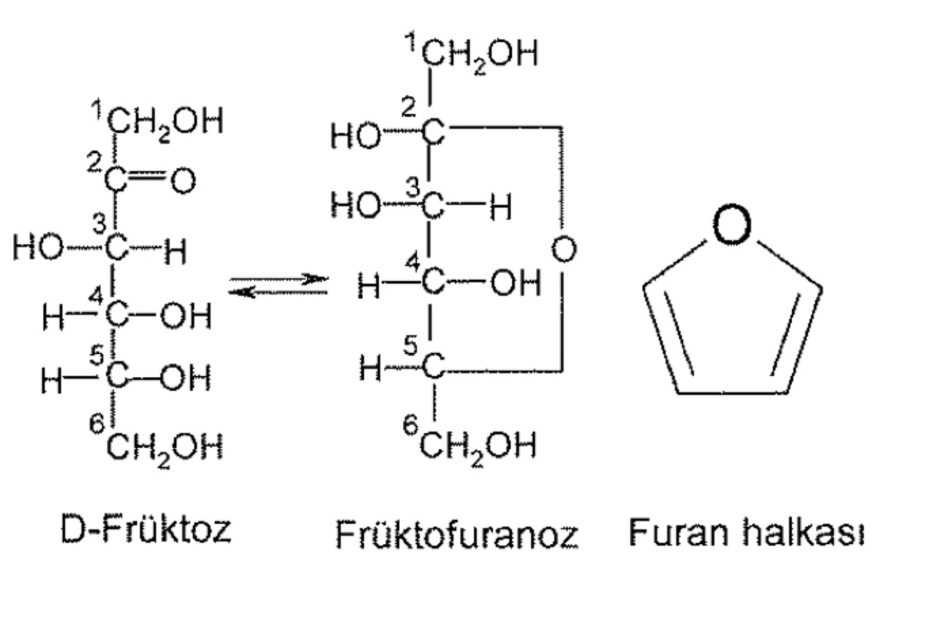 •Früktoz halkalanırken düz zincirde keto grubuna bağlı 2.karbon 5.karbona bağlı -OH ile kondanse olur ve hemiketal oluşur. Oluşan 5 karbonlu halka furan halkasına benzediği için furanoz olarak adlandırılır.