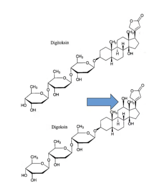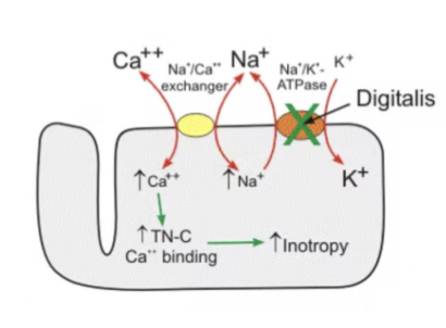 - Den molekylære virkningsmekanismen i ulike celler består i hemming av Na+-K+-ATPasen i cellemebranen som fører til økt intracellulær Ca++ via Na+-Ca++-byttemekanismen og muligens økt innstrømning gjennom ionekanaler