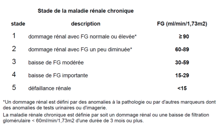 Quels sont les stades des maladies rénales selon le DFG ?