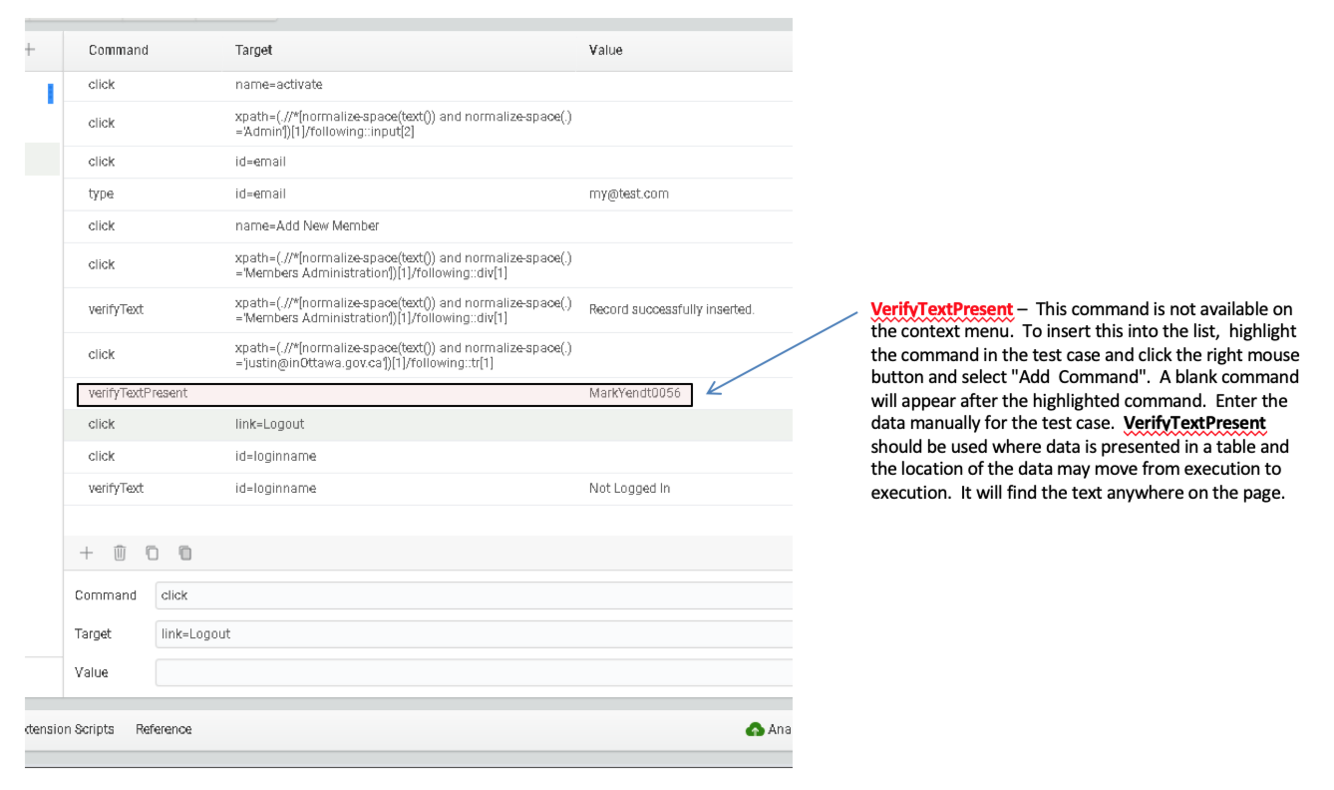 You can either click on the plus icon in the test case window beside the garbage can icon, or right click inside the test case window and click add command from the dropdown menu. Then you have to manually pick what type of command you would like the create, and the target/value parameters if needed.
