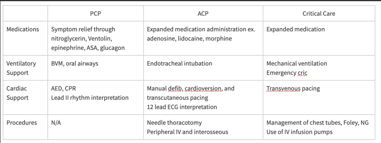 Contrast the skill set of PCPs, ACPs, and critical care paramedics with respect to: medications, ventilatory support, cardiac support, and procedures