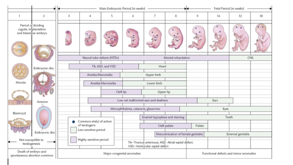 What stages of foetal development are different parts of the body effected?