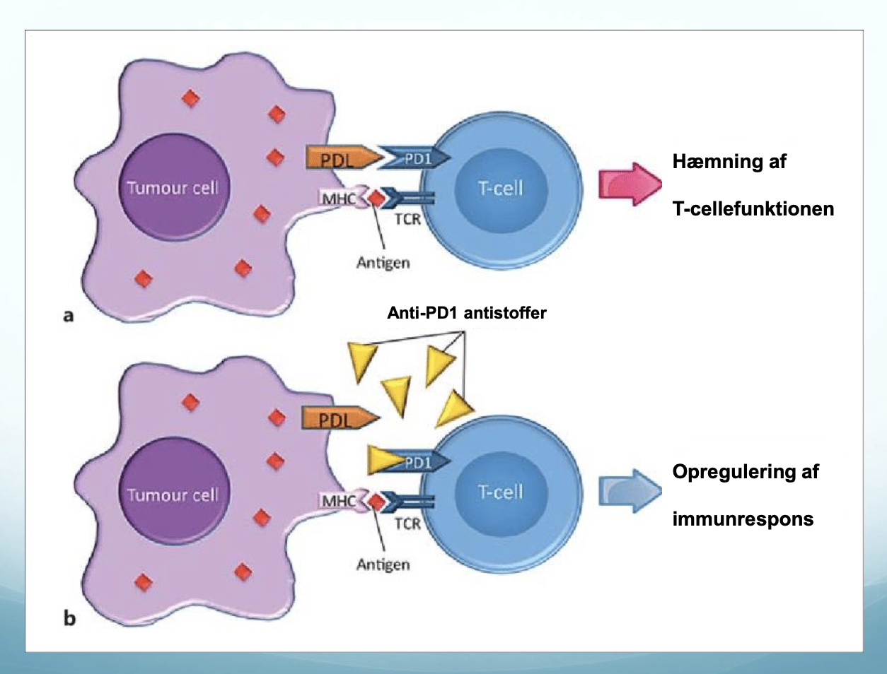 De mest anvendte antistoffer (nivolumab og pembrolizumab) virker ved at blokere et immunhæmmende protein (PD-1) på overfladen af T-cellerne.