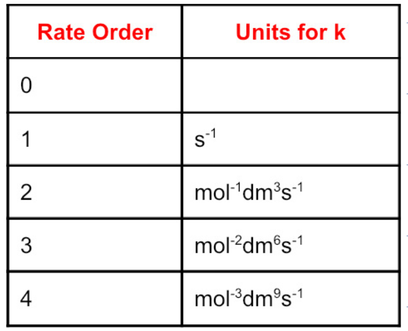 Units for rate constant (k)