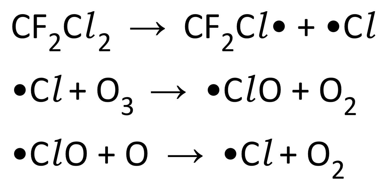 Outline mechanism for production of halogen radicals + breaking down of ozone layer