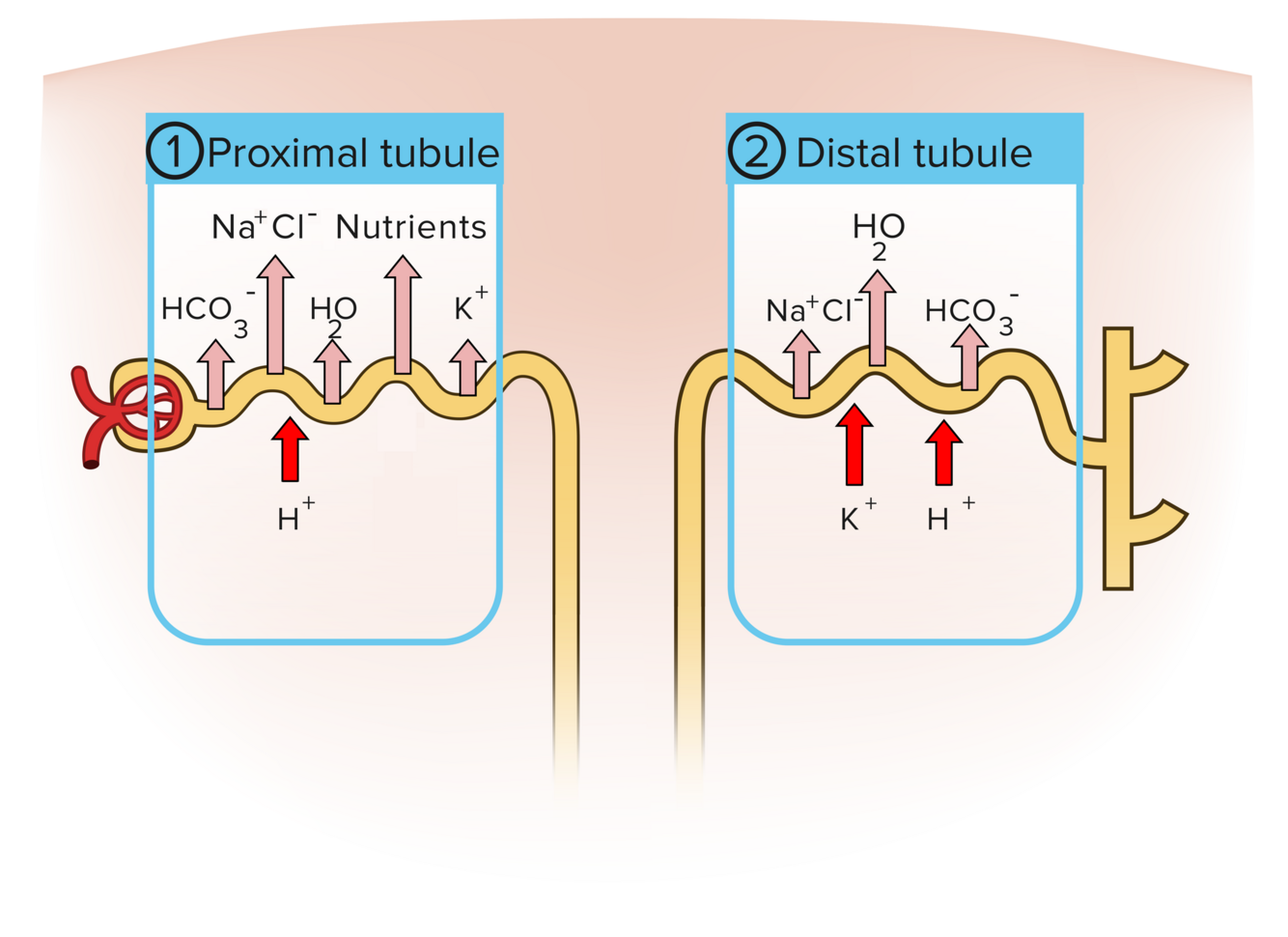 Both K+ and H+ are secreted in the proximal and distal tubules. H+ secretion is a vital part of pH balance.