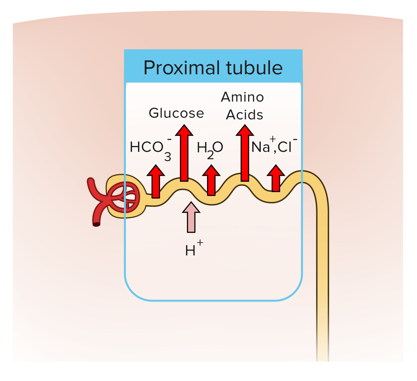 Name four molecules or ions that are reabsorbed in the proximal tubule.