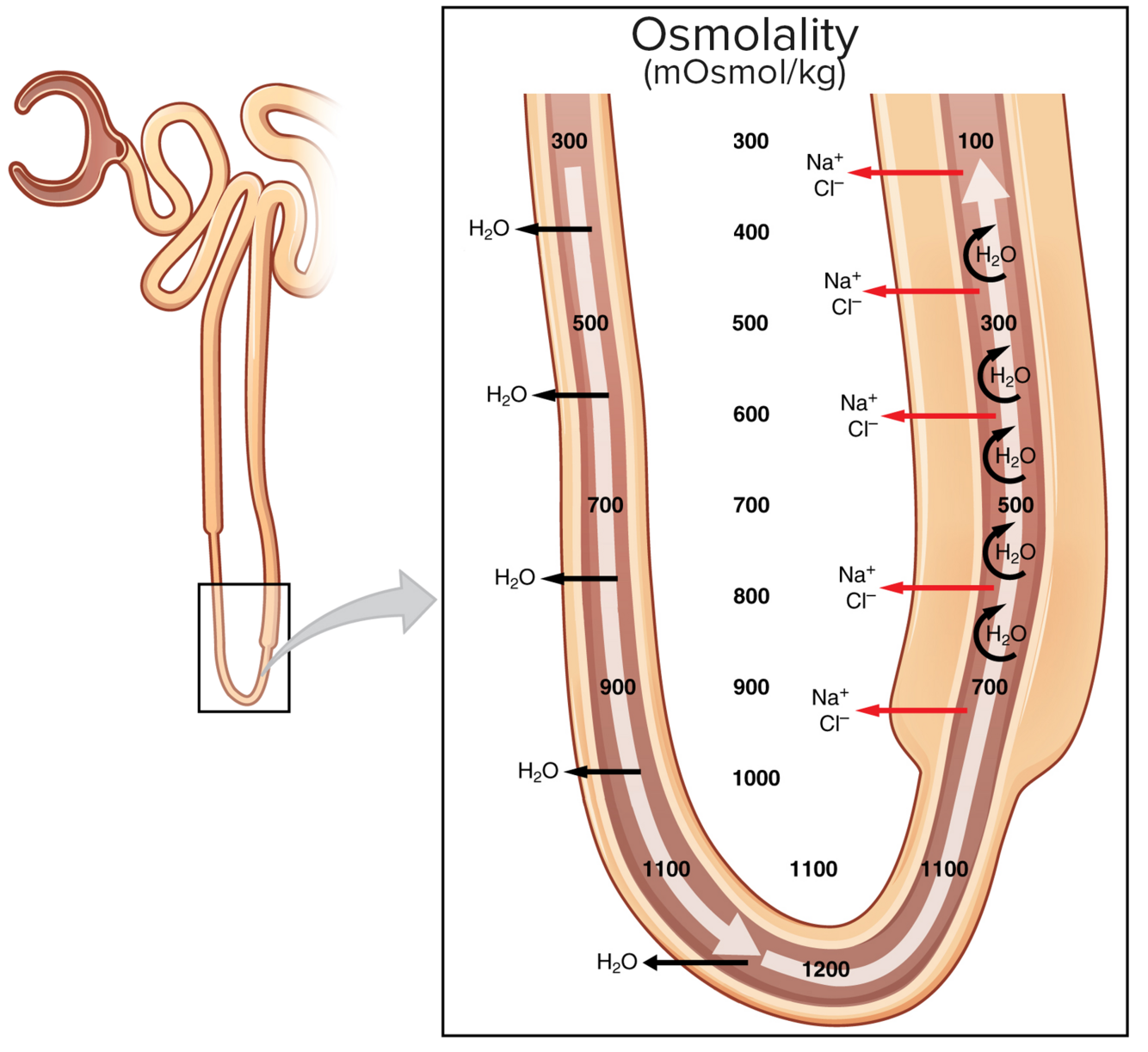 Sodium pumps in the ascending limb trigger a progressive increase in the amount of solute in the medulla. The unique structure of the loop causes this effect to compound or “multiply” over time.