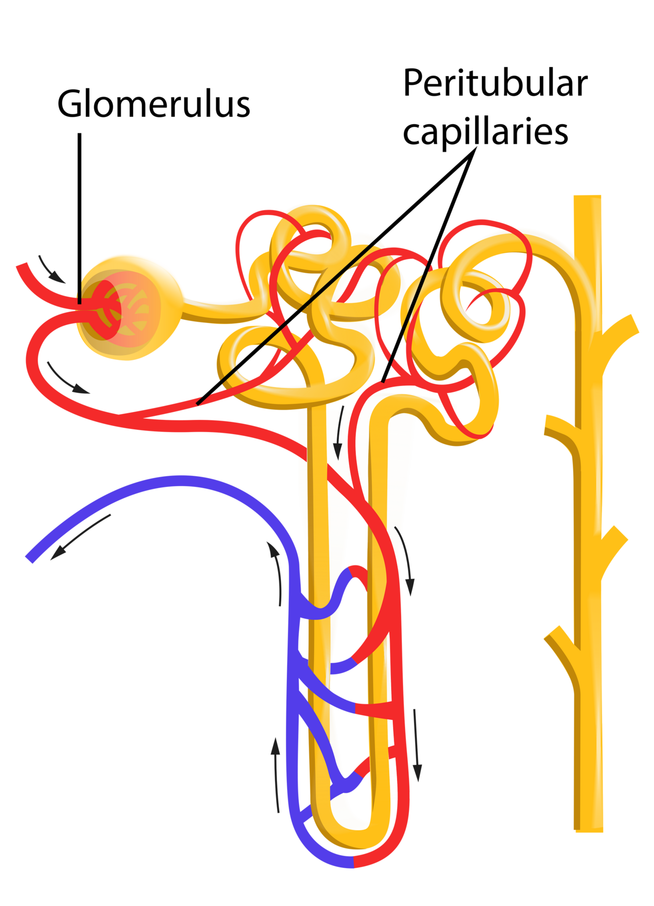 Name the two adjacent capillary beds that exchange material with the nephron.