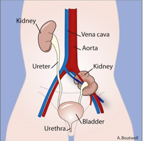Horseshoe Kidney (1/600) is usually asymptomatic and forms when the bilateral metanephric blastema get stuck together in the midline. Because the inferior mesenteric artery comes off of the ventral side of the aorta in the lower abdomen, the now horseshoe-shaped kidney gets caught under this vessel and cannot rise up to its normal location along the dorsal, retroperitoneal wall of the abdomen.
