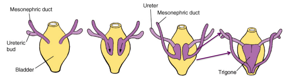 C. Growth of the dorsal bladder incorporates the mesonephric ducts and ureteric buds (of the metanephros) into the bladder wall. The remaining ureteric bud forms the ureter. The smooth area formed and bounded by the entry of the mesonephric ducts (future ductus deferens that empty into the prostate along with the seminal vesicles) and ureters is known as the trigone of the bladder. Stretch receptors here signal bladder fullness (flashback to Neuro).