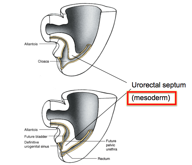 A. The urorectal septum, a mesodermal cone, divides the cloaca into the urogenital sinus and the rectum. Failure of this cone to create a good division between the rectum and bladder can lead to imperforate anus and other malformations of the external genitalia, and recto-vesicle fistulas (internal connections allowing leakage between the rectum and bladder). Although the lining of the rectum and bladder are associated with the endodermal germ layer, the segregation requires the mesodermal cone, and thus associates with mesodermal germ layer disorders (VACTERL), similar to the tracheo-esophageal separation you will learn aout in DMH.