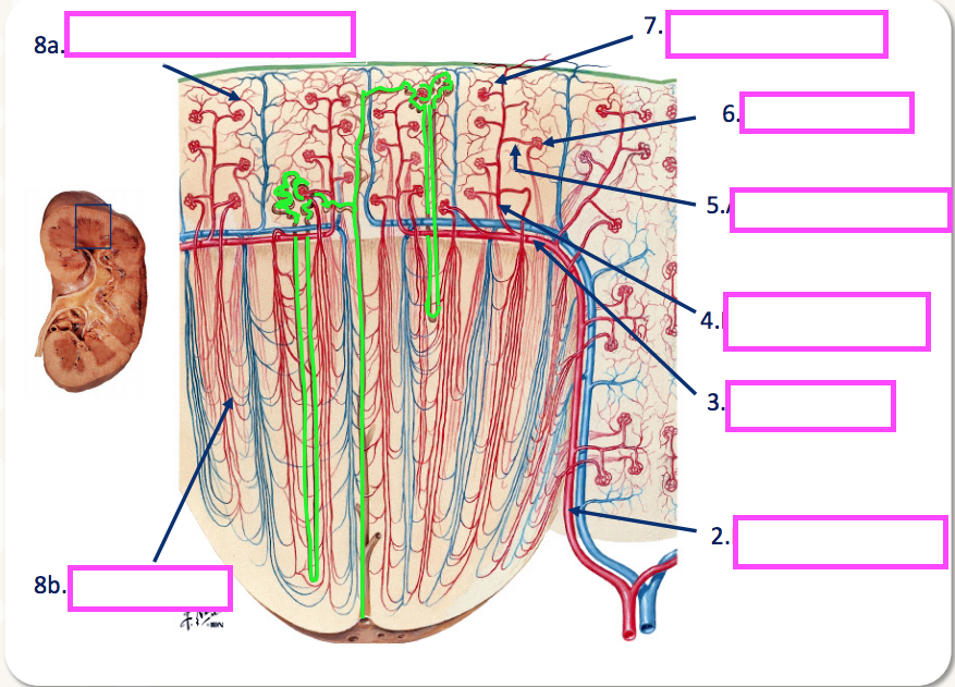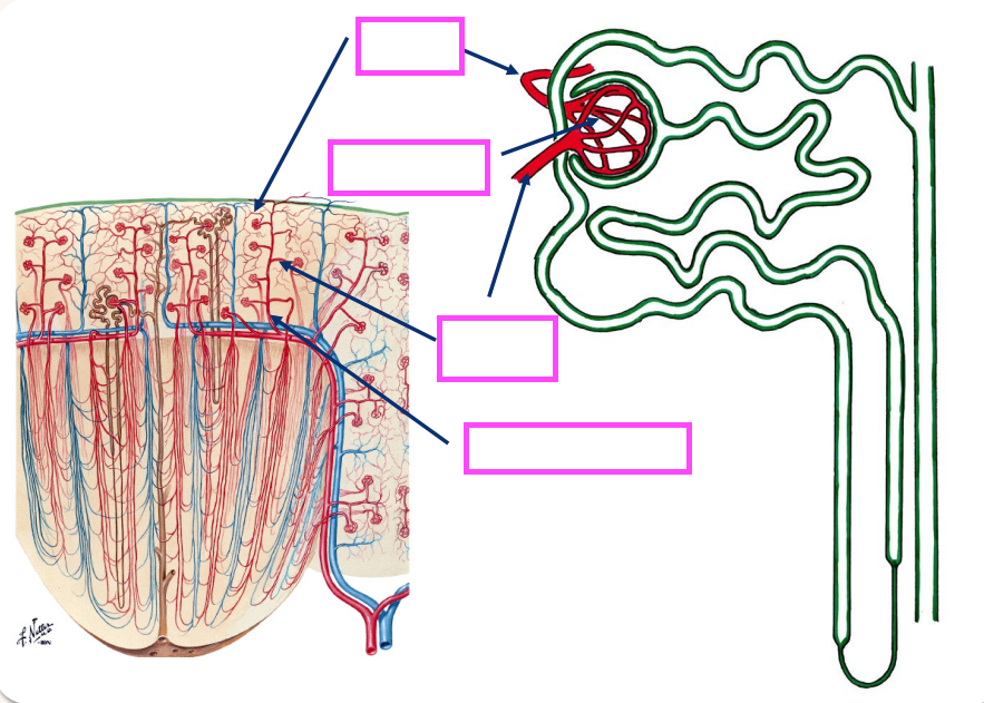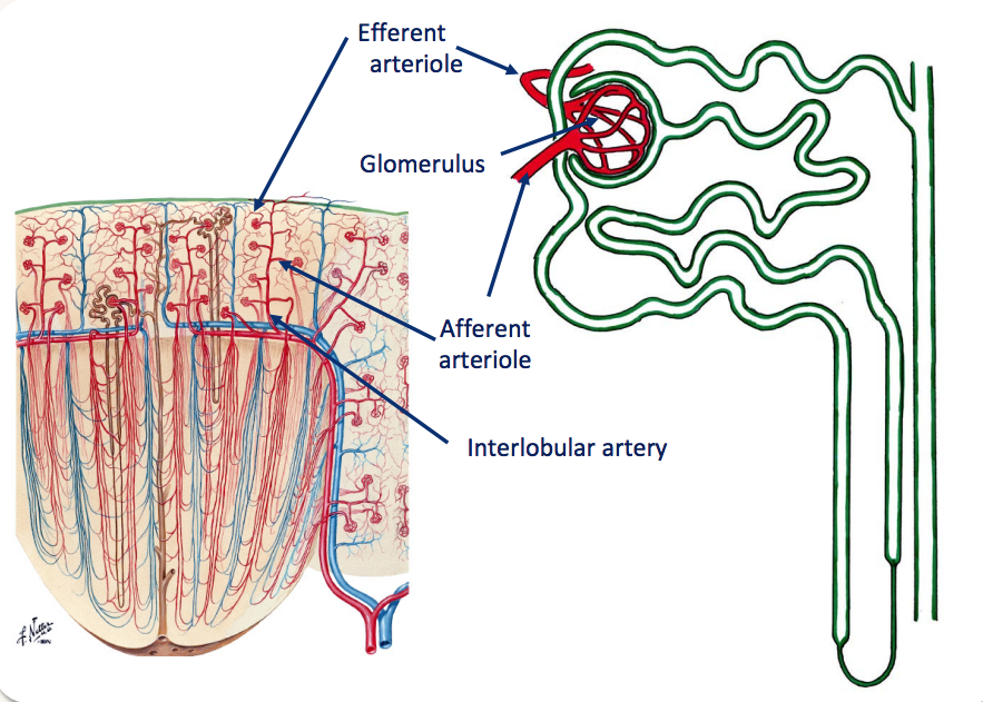 ***Note that all of the capillary supply serving the metabolic needs of the kidney derives from efferent arterioles. This means that any damage to the glomerulus is likely to cause secondary damage to the whole kidney due to impaired blood flow through glomerular capillaries.