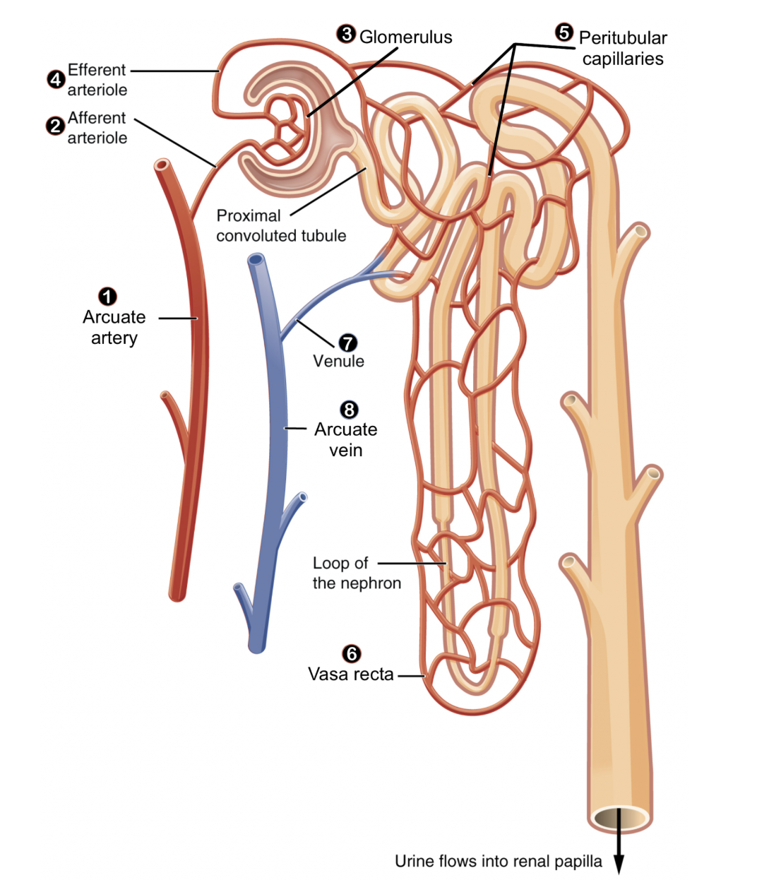 Renal arteries split into dorsal and ventral branches, interlobular then arcuate arteries. The arcuate arteries form the afferent glomerular arterioles. The efferent glomerular arterioles give rise to the vasa recta which are involved in water exchange and maintenance of medullary hypertonicity through counter current exchange. These drain into the venous system.