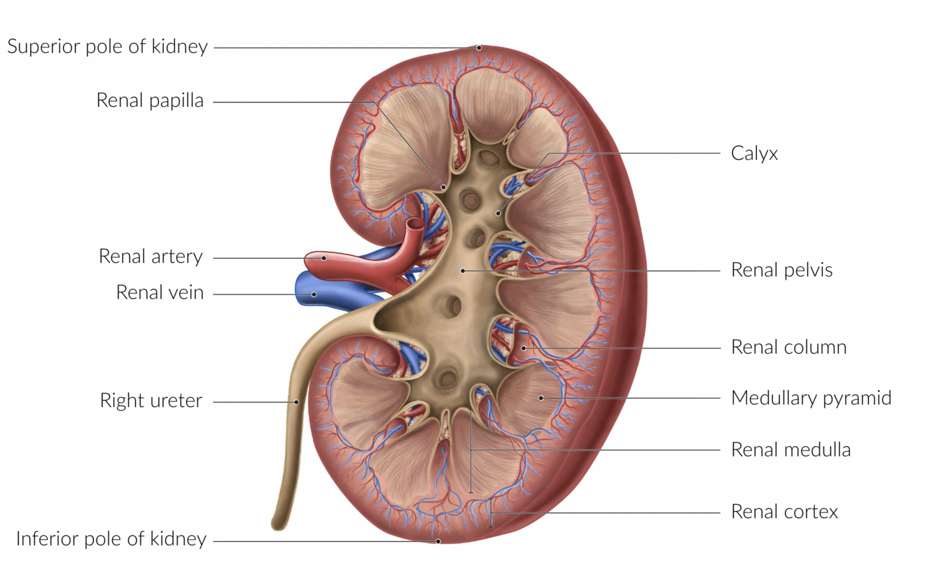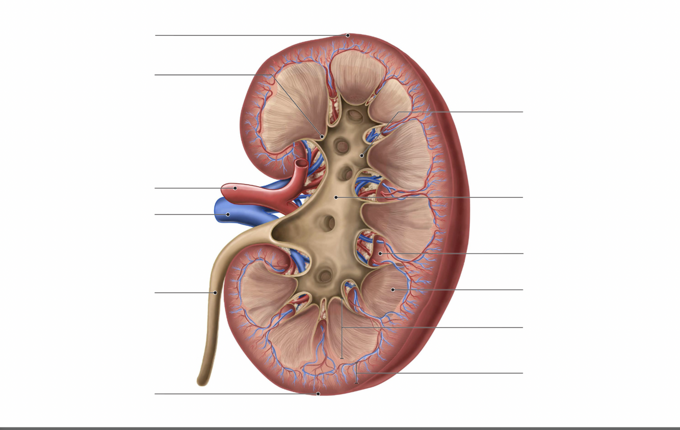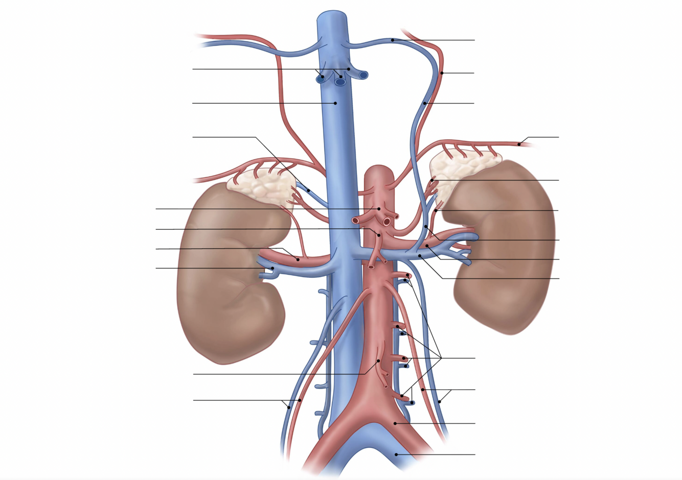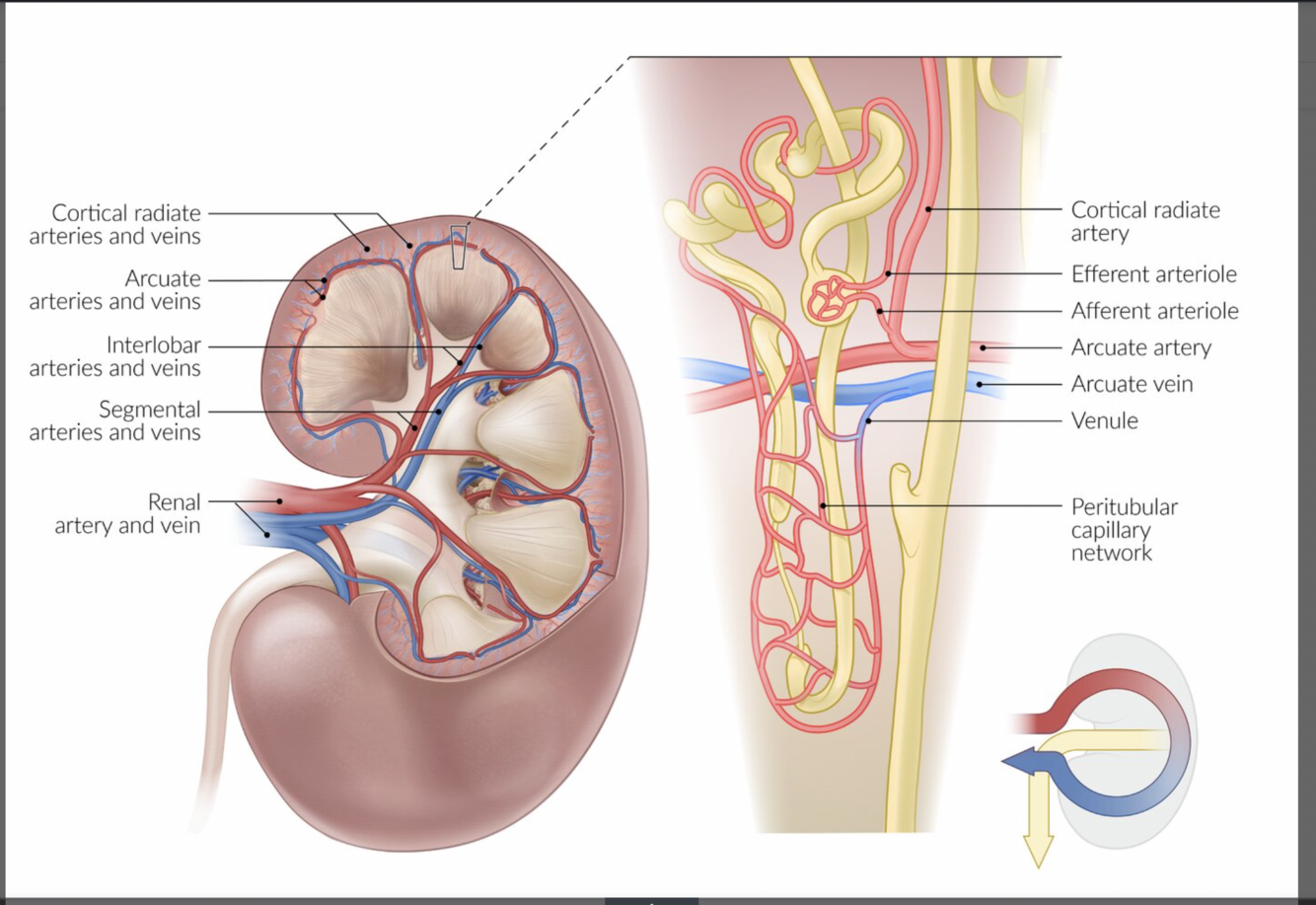 Renal blood flow: renal artery → anterior and posterior branches → segmental arteries → lobar arteries → interlobar arteries → arcuate arteries → interlobular arteries → afferent arteriole → glomerulus → efferent arteriole → vasa recta (→ venous system)