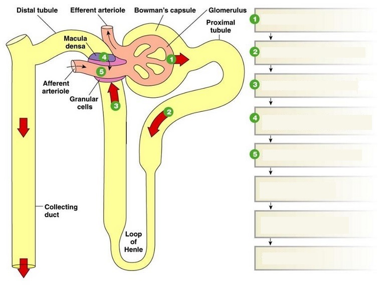 High pressure is maintained by afferent arteriole having larger diameter than efferent arteriole Substances are forced through the endothelial pores of the capillary, across the basement membrane and into the Bowman’s capsule.