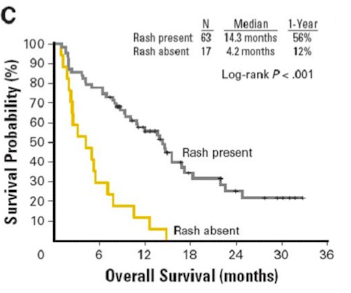 T or F: EGFR inhbitor associated skin rash means that they will have a good response and survive a lot longer