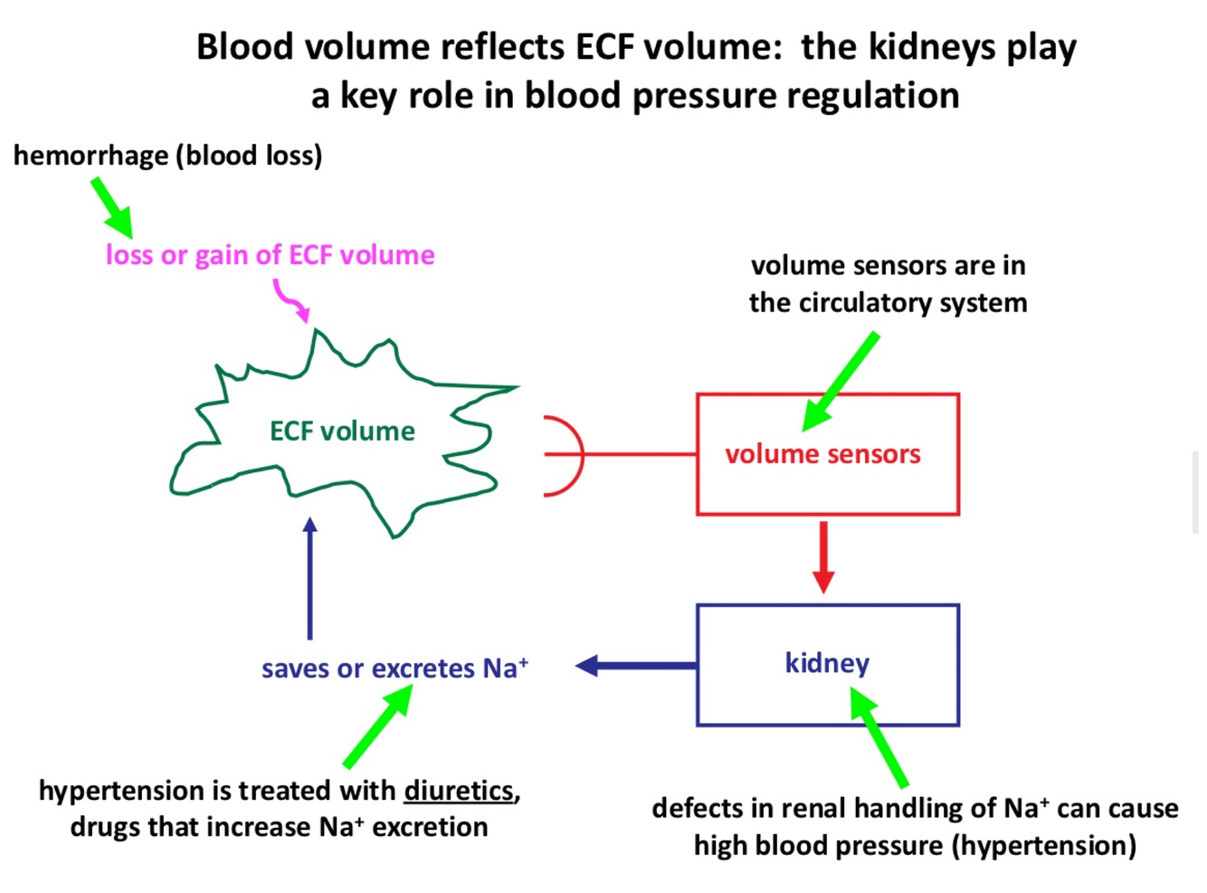 Explain why blood volume reflects ECF volume, and how regulation is set up knowing that. (How do the Kidneys get involved)
