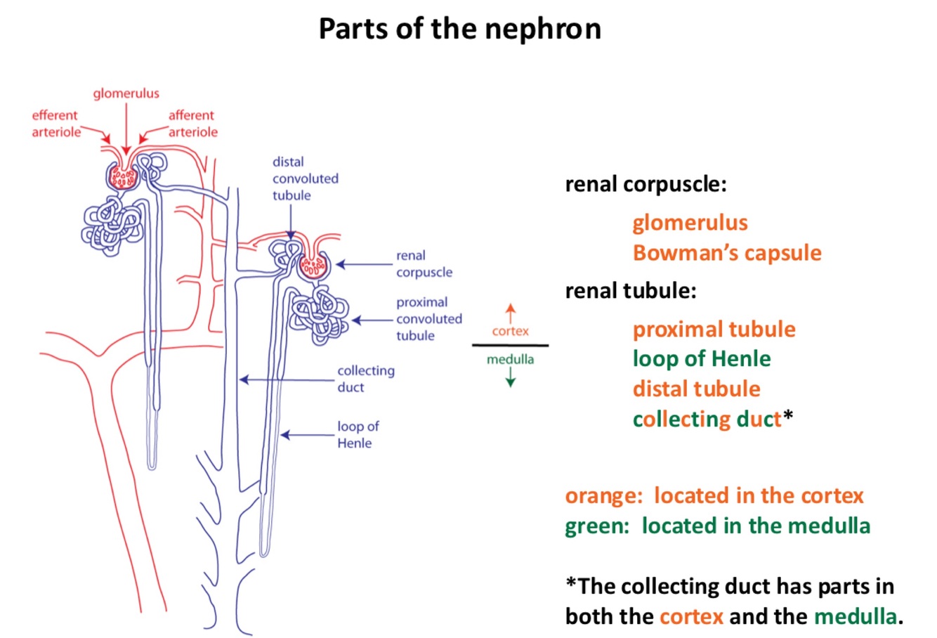 Can you name all the parts of a nephron (6), and if they belong to the cortex (4) or medulla (1) or both (1).