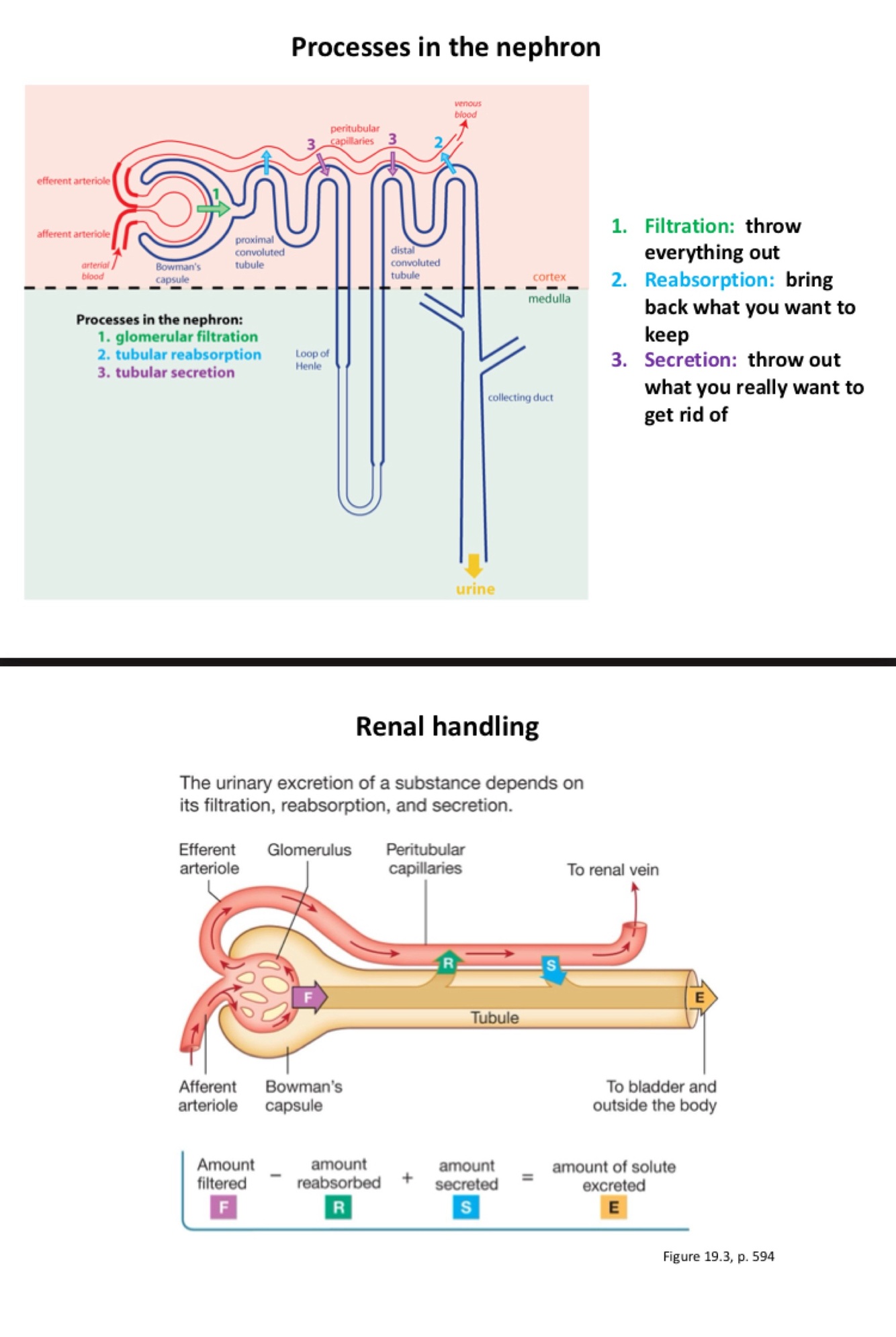 There are three main processes of the nephron, what are they? And where do they each happen respectively? What is the overall equation for amount of solute excreted?